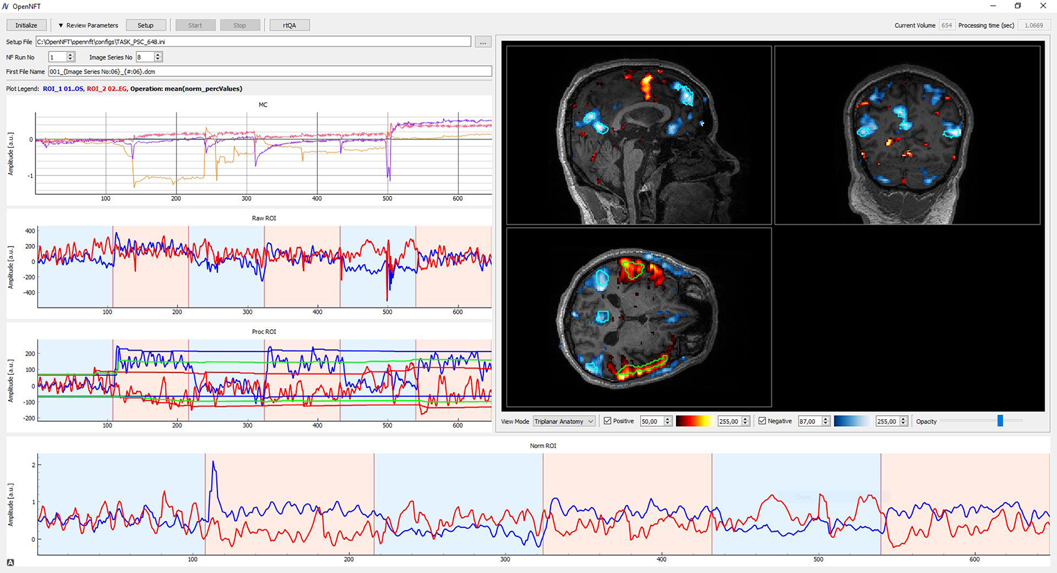OpenNFT is a GUI-based multi-processing open-source software package for real-time fMRI neurofeedback training and quality assessment. This package is based on best practices of the platform-independent interpreted programming languages Python and Matlab to facilitate concurrent functionality, high modularity, and the ability to extend the software in Python or Matlab depending on end-user preferences. OpenNFT includes, but is not limited to, the functionality of SPM, PsychoPy and Psychtoolbox software suits. The OpenNFT’s GUI, synchronization module and multi-processing core are implemented in Python, whilst computational modules for real-time data processing and neurofeedback are implemented in Matlab.